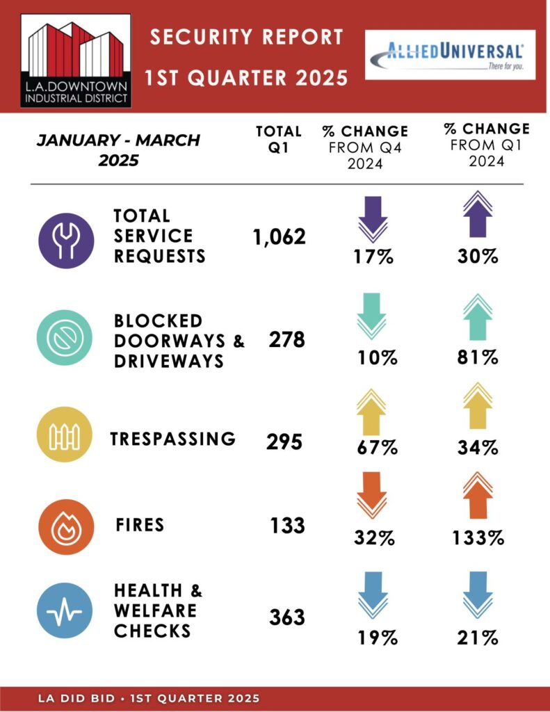 The Industrial District BID regularly tracks a number of security and maintenance statistics, with selected indicators. Here’s the overview of the stats. Continue scrolling down to see more details.